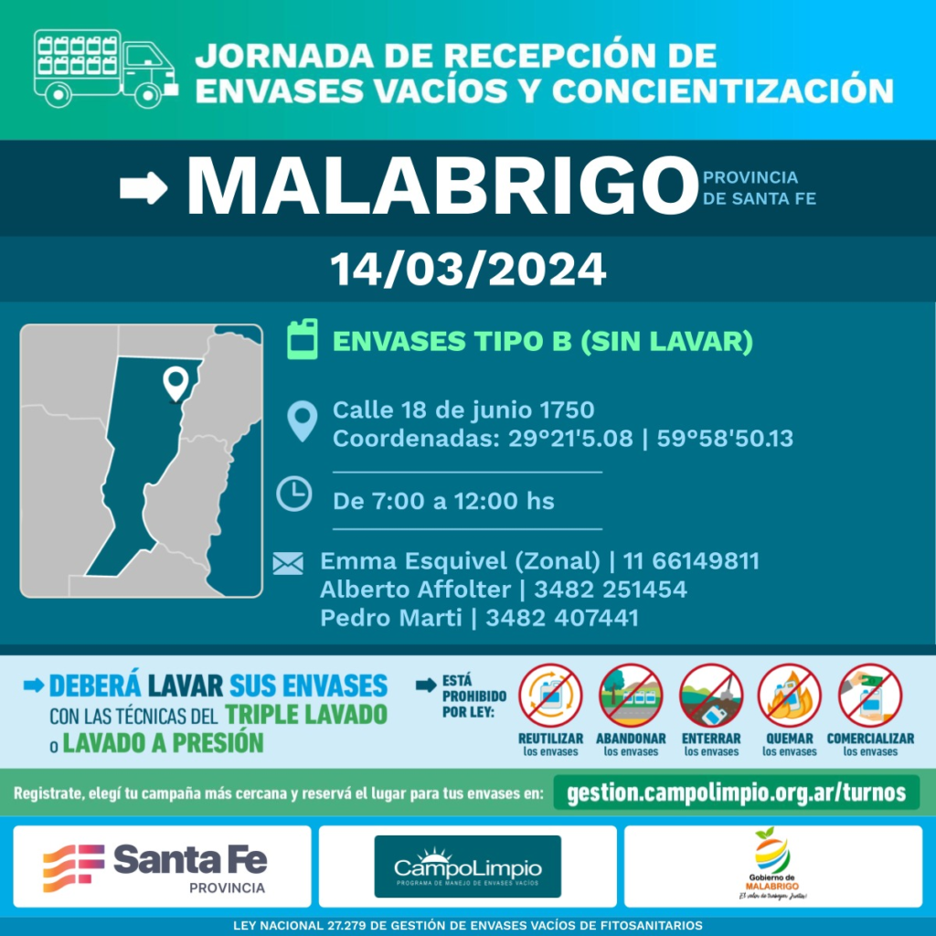 馃憠 El pr贸ximo jueves 14 de marzo, el Gobierno de Malabrigo, la Cooperativa Agropecuaria y Campo Limpio, llevar谩n a cabo una importante actividad de recepci贸n de envases vac铆os de fitosanitarios.