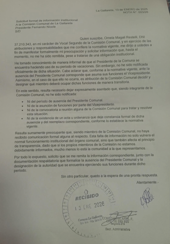 A raíz de una nota presentada por Ornella Magalí Restelli, representante de la minoría, en la que solicitaba información institucional, tal como se expresa en el documento al que se hace referencia en este informe y que no habría sido respondida, se desató una fuerte polémica en los últimos días en la localidad de La Gallareta.