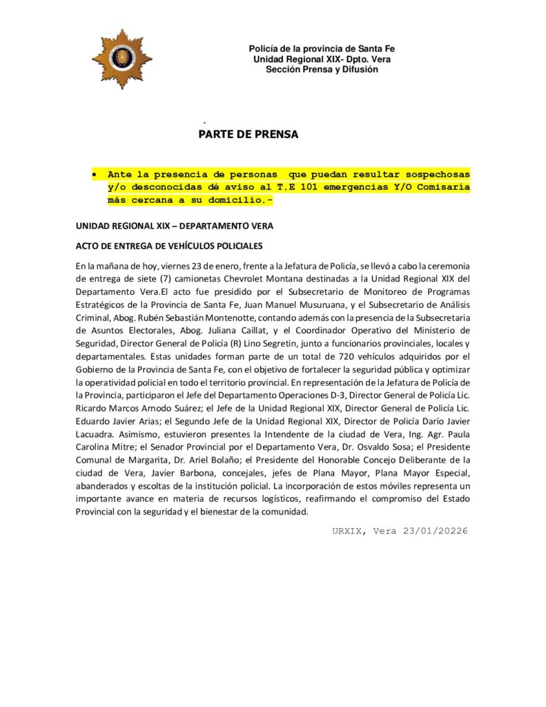 Hoy por la mañana, la Provincia de Santa Fe, a través del Ministerio de Seguridad y con un esfuerzo digno de destacar, entregó siete (7) vehículos a la Unidad Regional de Vera.