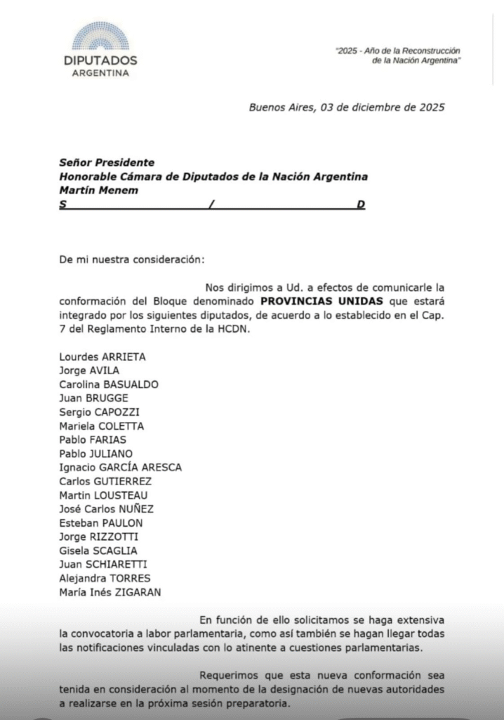 Lista de los Diputados que conforman en nuevo Bloque de Provincias Unidas