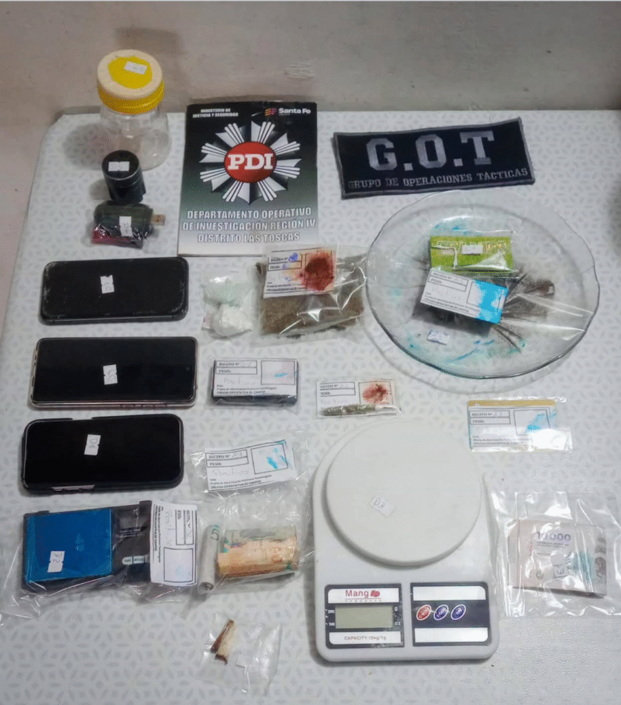 En el inmueble ubicado en la intersección de calles Tucumán y Santiago del Estero, los efectivos lograron el secuestro de dos balanzas de precisión, envoltorios con clorhidrato de cocaína, un plato con vestigios de sustancia, teléfonos celulares y anotaciones de interés para la causa.